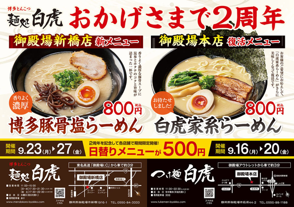 さらに 麺処白虎は2周年を迎えます! これもひとえに日頃から御愛顧いただいているお客様のおかげです!