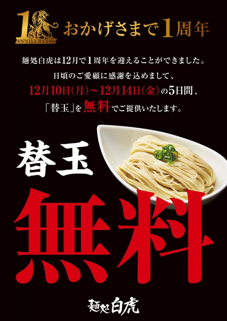 麺処白虎は12月で「1周年」を迎えることができました。