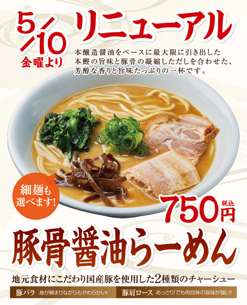 5/10(金)より大人気『豚骨醤油らーめん🍜』がさらにおいしくリニューアルしました!